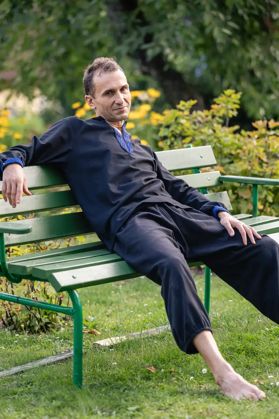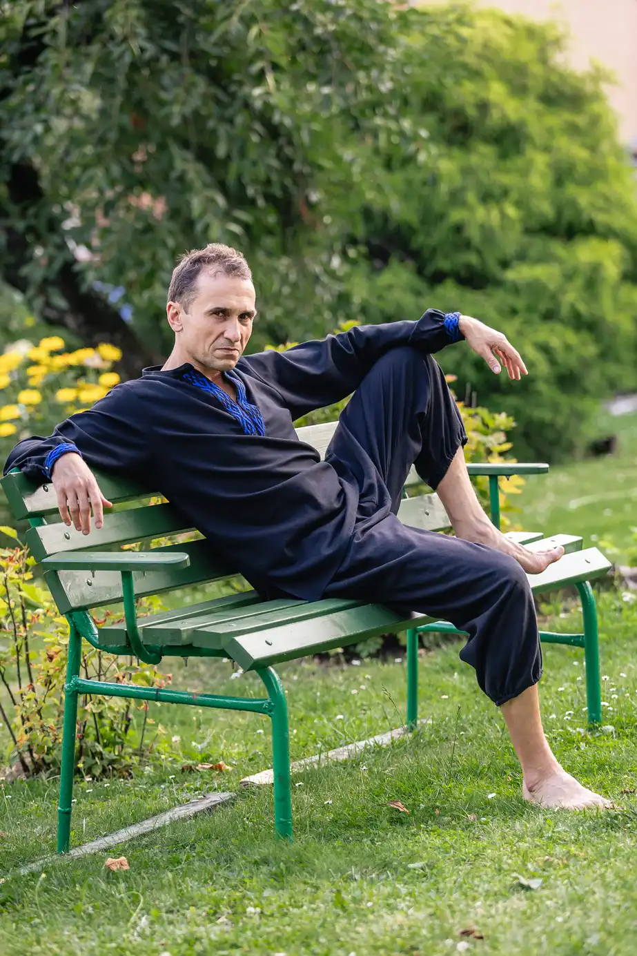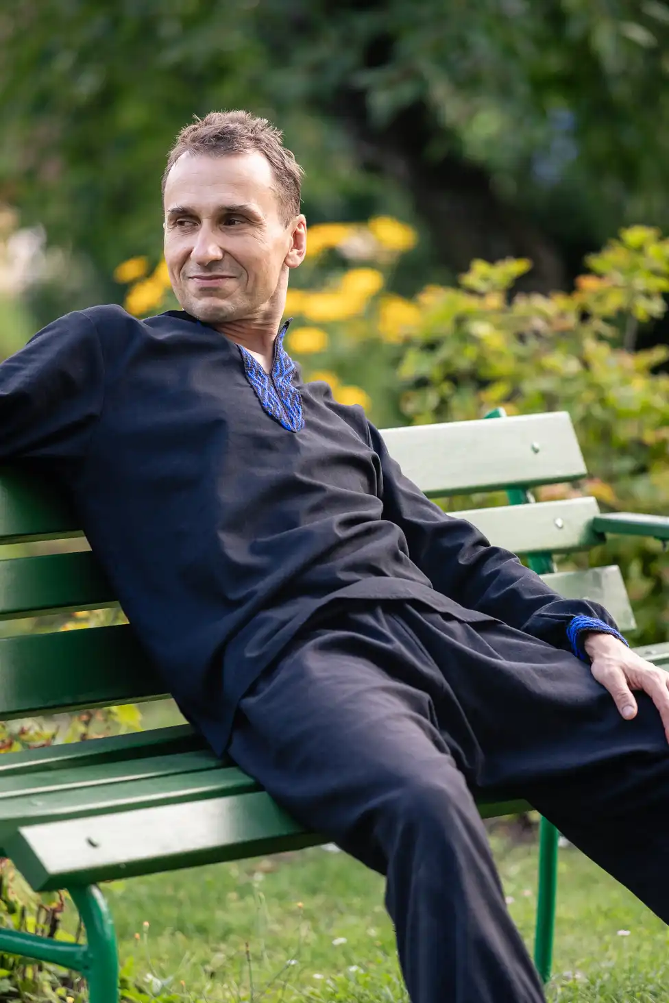 Koszula męska, z czarnego lnu przy szyi wykończona stójką. Mankiety rękawów wykonane z ręcznie tkanej krajki - obszytej tkaniną na końcówkach, by zapobiec strzępieniu się - zapinane na zatrzask. Na piersi naszyta krajka tkana ręcznie – na czarnym tle wyrazisty, szafirowy wzór wybierany.