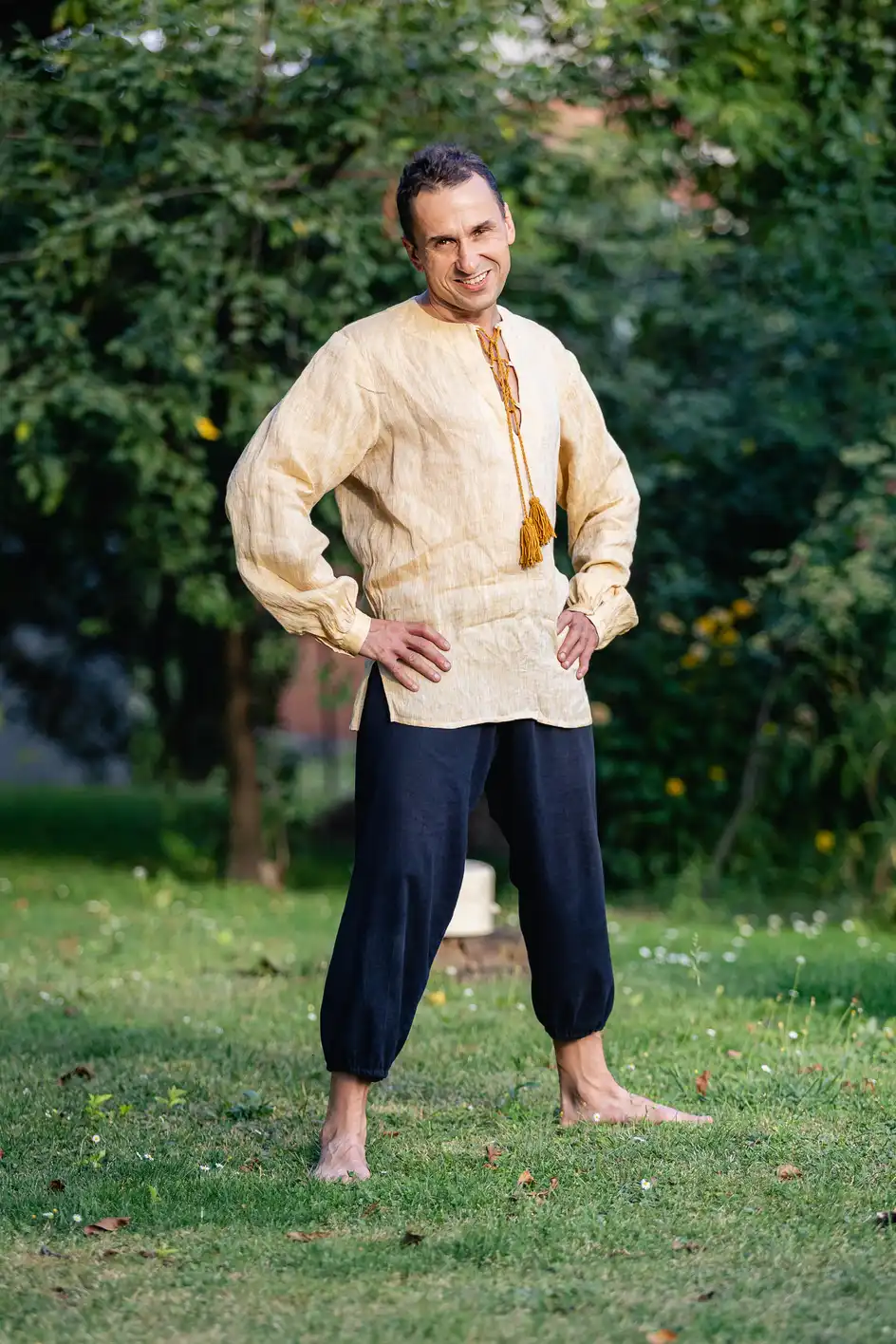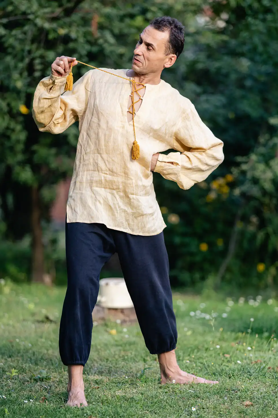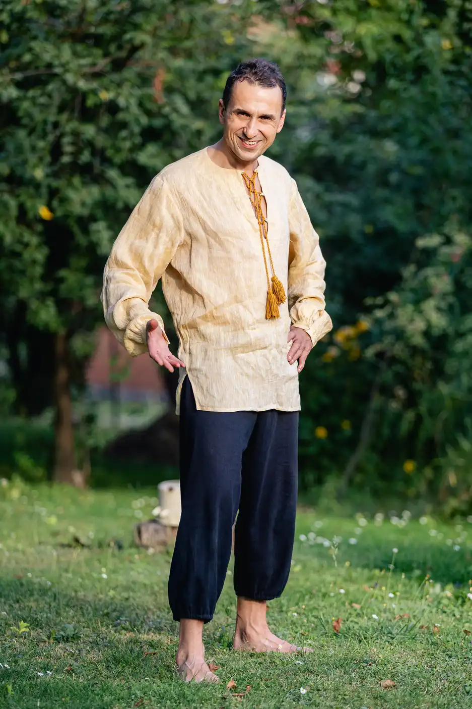 Koszula męska, wygodna z gładkim wykończeniem przy szyi, wiązana ręcznie skręconym, sznureczkiem w kolorze musztardowym, zakończonym chwościkami. Mankiety wąskie, zapinane na zatrzask. Len w ciekawym, złotawym, jasnomusztardowym kolorze, przewiewny lekki.