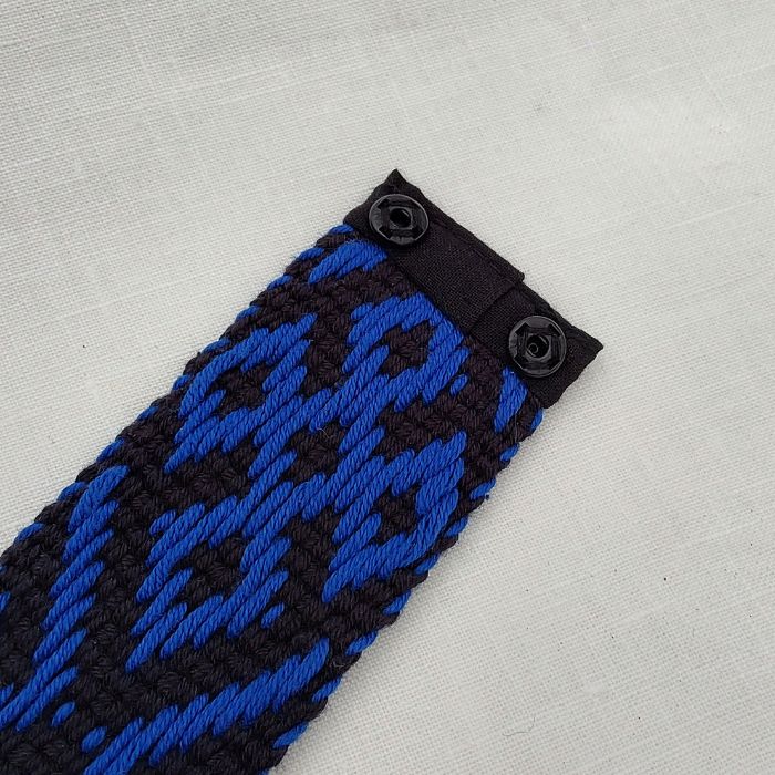 Przyjemna w dotyku bransoletka. Bardzo wyrazisty szafirowy wzór na czarnym tle. Obie nitki matowe. Końcówki obszyte czarnym płócienkiem bawełnianym.